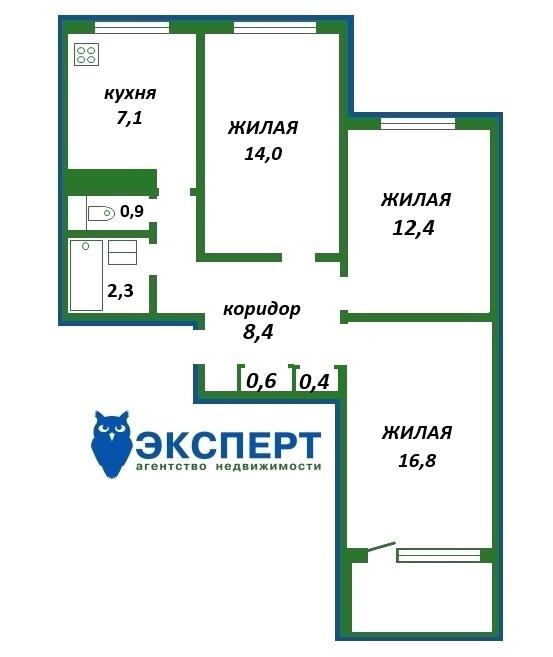 Площадь о/ж/к: 62.84 / 43.13 / 7.12 кв.м.