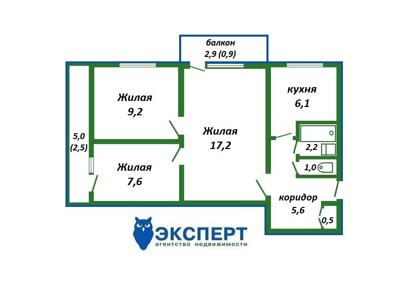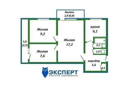 Площадь о/ж/к: 52.8 / 34 / 6.1 кв.м.