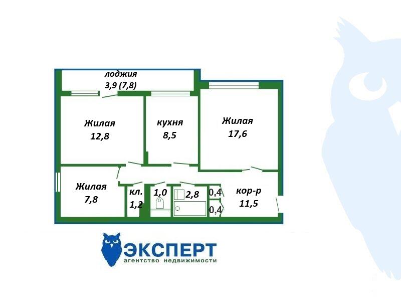 Площадь о/ж/к: 64 / 38.2 / 8.5 кв.м.