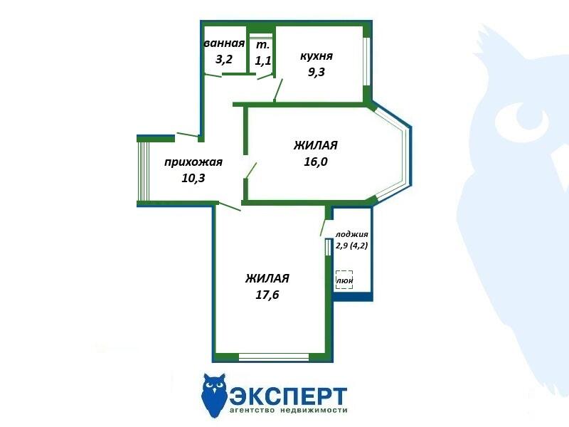 Площадь о/ж/к: 57.5 / 33.6 / 9.3 кв.м.