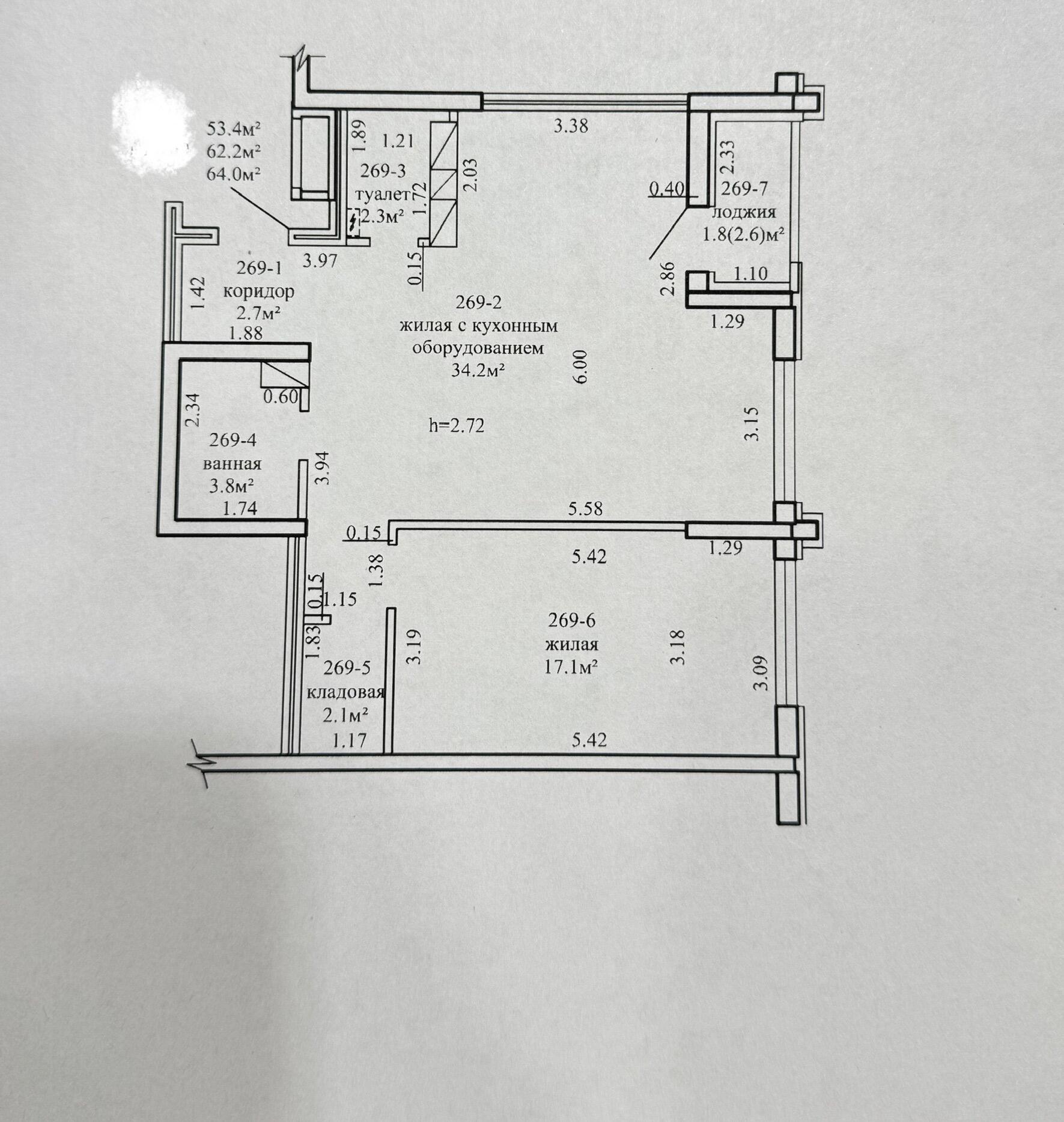 Площадь о/ж/к: 64 / 62.2 / - кв.м.