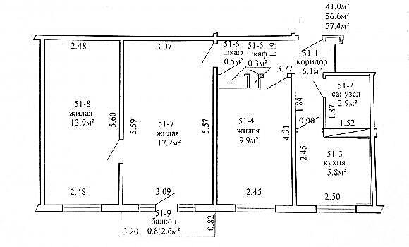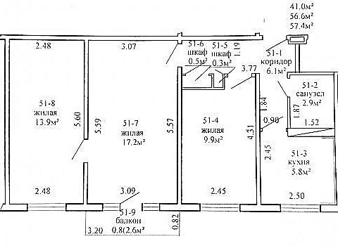Площадь о/ж/к: 57 / 41 / 6 кв.м.
